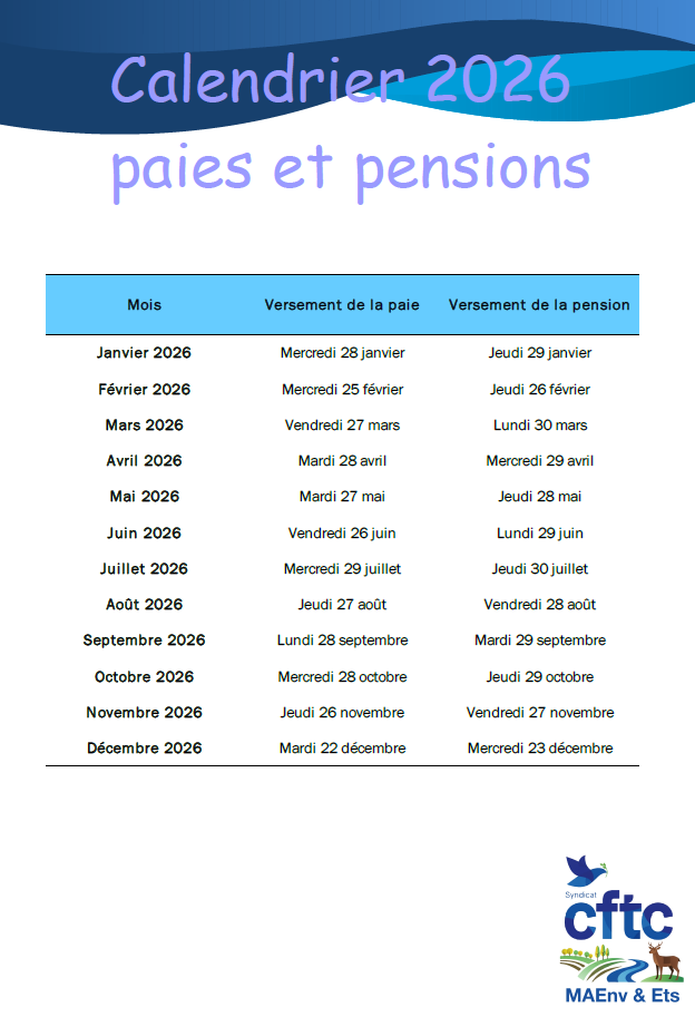 Consulter le calendrier prévisionnel de la mise en paiement des paies et des pensions des agents publics de l’État pour 2026.