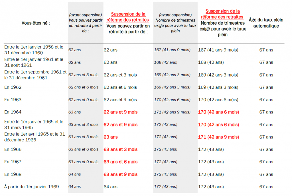 Tableau de décalage des âges de départ à la retraite suite à la suspension de la réforme des retraites de 2023 (agents de catégorie sédentaire) :